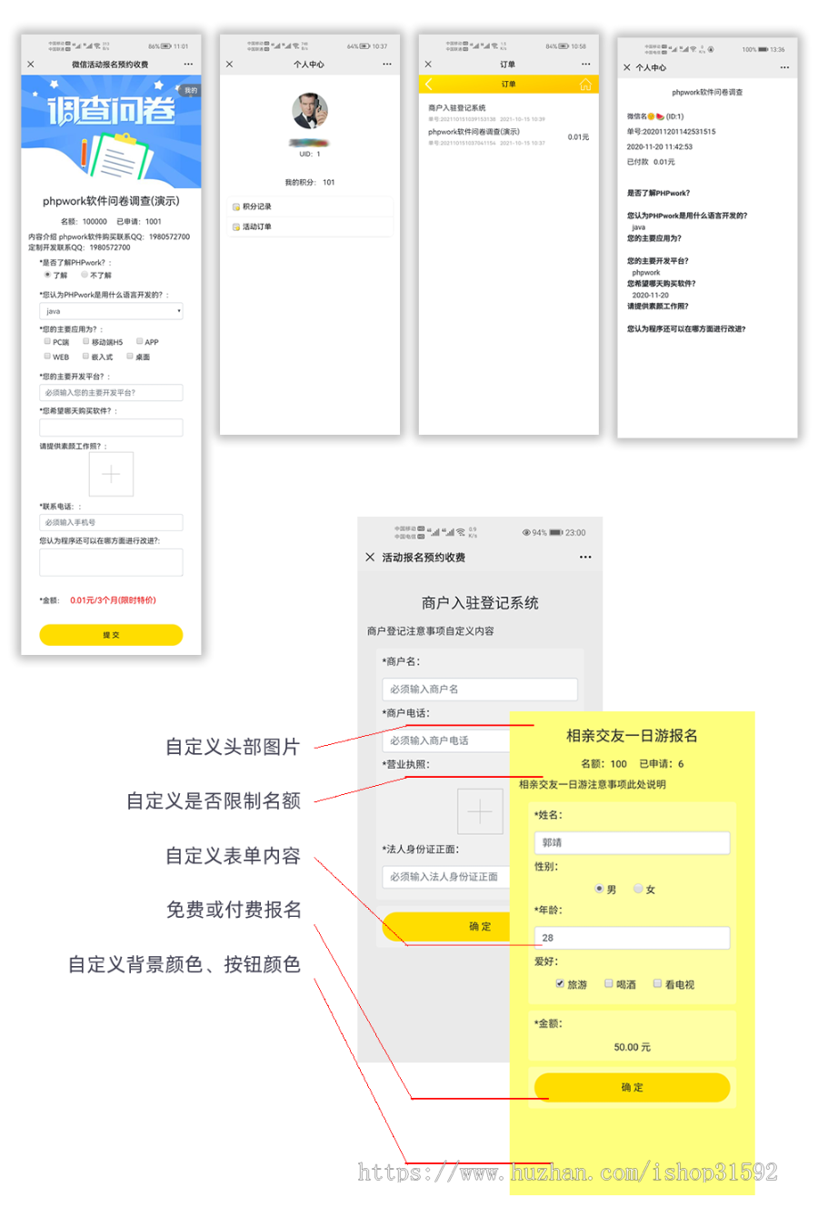 通过打开自定义的表单页面,输入自定义的指定信息,可以实现活动订单收款。