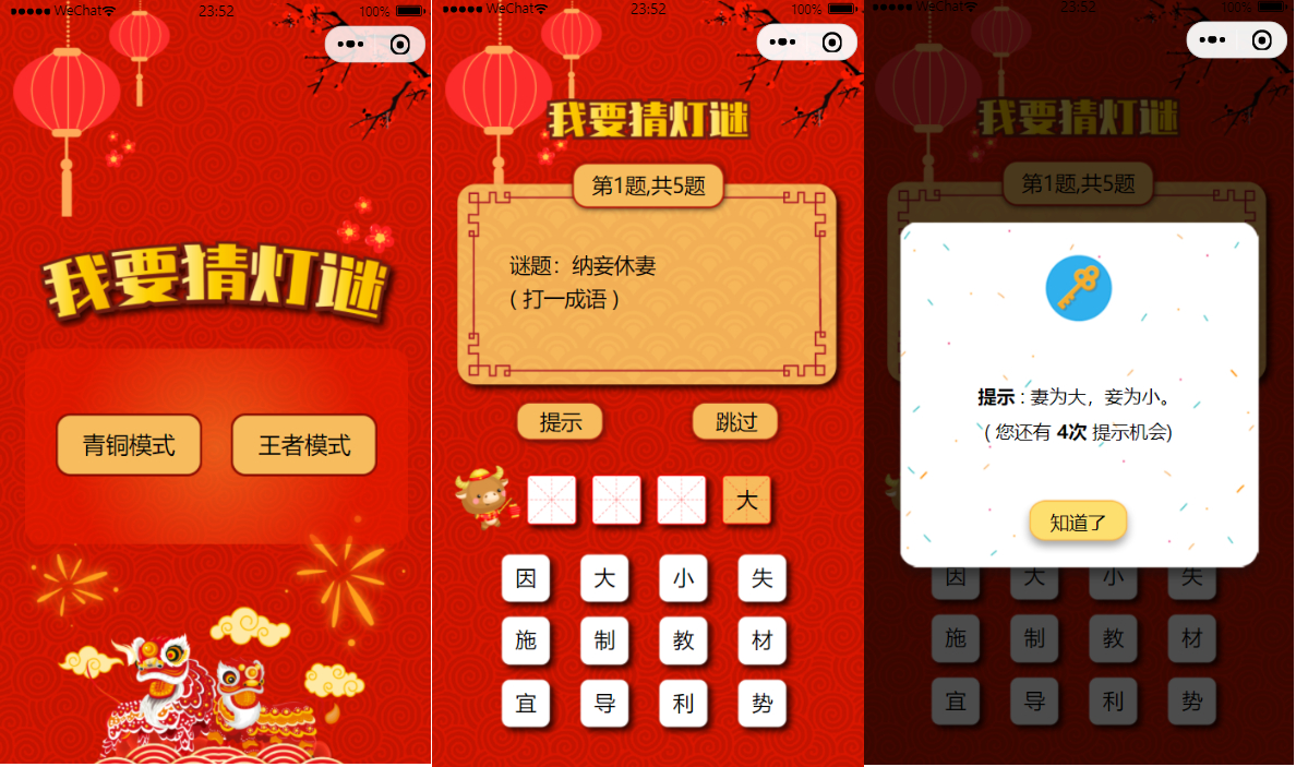 猜灯谜小程序分两种模式青铜模式(普通)和王者模式(困难),另外猜题里面还支持答案提示,当然是有次数限制的。